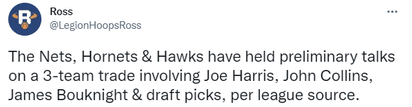 据美媒Ross报道,篮网、黄蜂和老鹰已经就乔-哈里斯、科林斯、詹姆斯-布克奈特以及选秀权的三方交易进行了初步谈判;这意味着乔-哈里斯可能离开篮网。