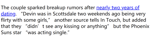 美媒In Touch报道称,布克和詹娜分手了一周半,但布克在两周前被看到在斯科茨代尔(亚利桑那州的一个城市)与多个女孩调情。消息人士透露,虽然布克没有被拍到和那些女孩亲吻,但这位太阳球星明显表现得像单身一样。