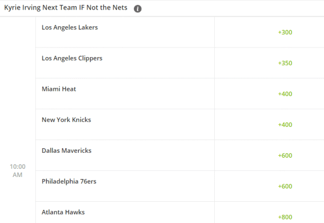 再来看看欧文的下家赔率。如果欧文离开篮网,效力下支球队具体赔率排名如下:1.湖人(+300)、2快船(+350)、3.热火(+400)、3.尼克斯(+400)、5.独行侠(+600)、5.76人(+600)、7.老鹰(+800)、8.掘金(+1100)、9.公牛(+1200)、10.活塞(+1400)。