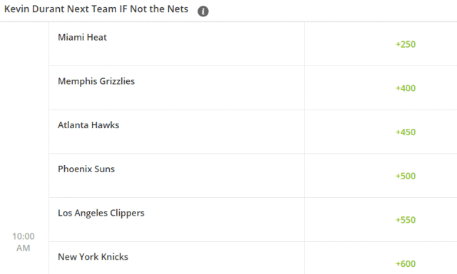 先来看看杜兰特的下家赔率。如果杜兰特离开篮网,效力下支球队具体赔率排名如下:1.热火(+250)、2.灰熊(+400)、3.老鹰(+450)、4.太阳(+500)、5.快船(+550)、6.尼克斯(+600)、7.开拓者(+750)、8.雷霆(+800)、9.湖人(+1200)、10.勇士(+1400)。