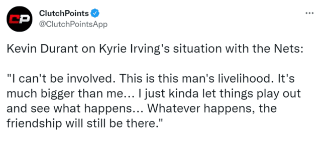 杜兰特在今天的节目上谈到了欧文。“我不能参与欧文的决定,这是他的生活。相比较而言,这比我更重要。我只是让事情顺其自然,看看会发生什么。无论发生什么,我们之间的友谊都不会变。”