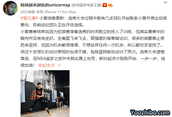 根据欧洲篮球及NBA选秀专家王健表示:“选秀大会结束后,当天现场就有几支球队开始联系小曾并表达后续意向,目前经纪团队正在评估选择。小曾赛季结束后因为怕浪费准备选秀的时间就立刻投入了训练,但其实赛季中的脚伤并没有完全好。全美国飞来飞去,高强度的背靠背试训,很多时候要靠止疼药来坚持,但因为机会都很难得,不想放弃任何一次机会,所以都咬牙坚持了。将近十支球队的试训表现的也很不错,包括篮网前后试训了两次。选秀大会遗憾落选,但NBA追梦之旅并未就此画上句号,新的起点才刚刚开始,一步一步,继续加油!”