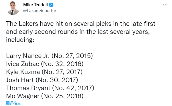 过去几年,湖人用首轮末端以及次轮签选中不少潜力股,湖人随队记者Mike Trudell晒出了湖人历年在相似顺位选中的球员:2015年第27顺位选到小拉里-南斯,2016年第32顺位选中祖巴茨,2017年第27顺位选到库兹马;2017年第30顺位挑到哈特;2017年第42顺位选中托马斯-布莱恩特和2018年第25顺位选中莫里茨-瓦格纳。