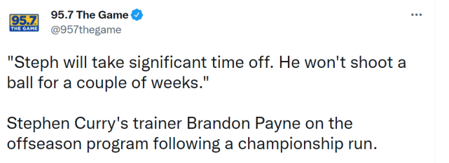 搞笑的是,就在今天上午,库里的私人训练师Brandon Payne在节目上谈到训练计划。他说:“库里会休息很长一段时间,他在这几周内都不会去投篮。”