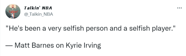 不少球队希望欧文离开篮网,因为他们相信这会让他们有机会通过交易得到杜兰特。当然,杜兰特还在合同期内,只不过当下球星的权力越来越大,若他们申请交易,球队可能也不得不配合。篮网目前已经在悬崖的边上。外界对欧文的吐槽也仍在继续,前NBA球员马特-巴恩斯表示:欧文一直是一个非常自私的人和自私的球员。