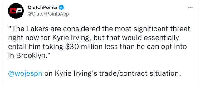 沃纳罗斯基表示,如果欧文不执行球员选项,直接与湖人签约,他能得到的只是600万左右的中产,要损失3000万左右的薪水。不愿意减薪,就只能先签后换。欧文与杜兰特的联系就像一张多米诺骨牌,他们若拆开,篮网现有核心就会因此解散。