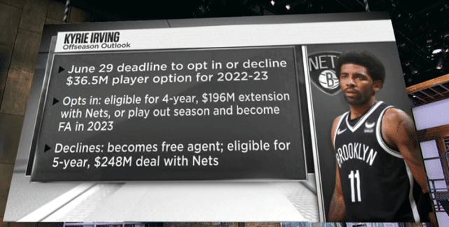 美媒也列出了欧文合同的关键点:6月30日(北京时间)是欧文决定是否执行3650万球员选项的截止日,他若执行选项,有资格最多签一份4年1.96亿美元的合同,也可以不续约,在2023年成为自由球员。他若不执行选项,将直接成为自由球员,最多可以和篮网签5年2.48亿美元。