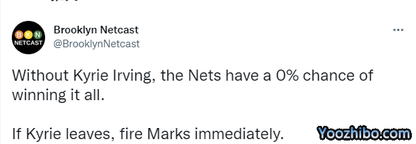 篮网媒体Brooklyn Netcast发推写道:没有欧文,篮网毫无夺冠的希望,如果欧文离队,他们应该立即解雇总经理马克斯。
