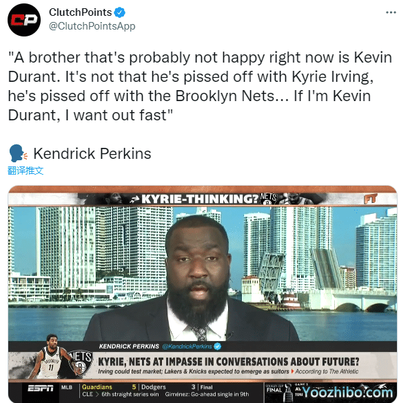 帕金斯还说:如果篮网不能和欧文谈妥的话,而欧文离开篮网与别的球队签约,比如有詹姆斯的湖人。如果我是杜兰特,我会想要离开篮网,我会想立马走人。