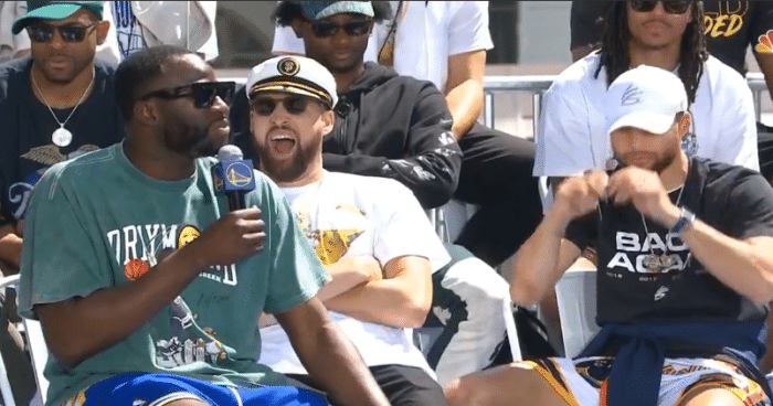 在庆典现场,主持人说汤普森没有在G6赛后落泪,汤普森打断并且调侃:谁会在球场上哭啊;库里哈哈大笑并且表示:球场上还不能哭了?克莱继续冷酷地回复:我又没哭,可你哭了啊。