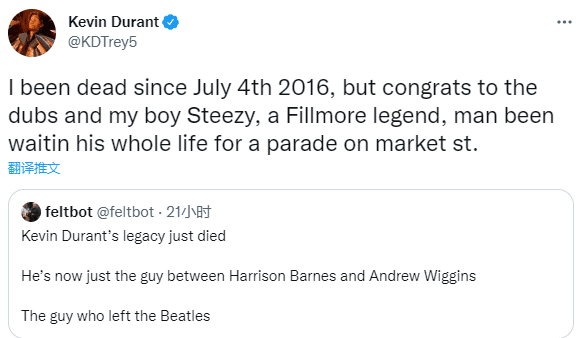 杜兰特转发了这一推文,同时回应道:在2016年7月4日(杜兰特宣布加盟勇士的日子)我的名声就已经毁了,但我要祝贺勇士和Steezy(歌手),那个一辈子都等着在Market Street游行的旧金山传奇。