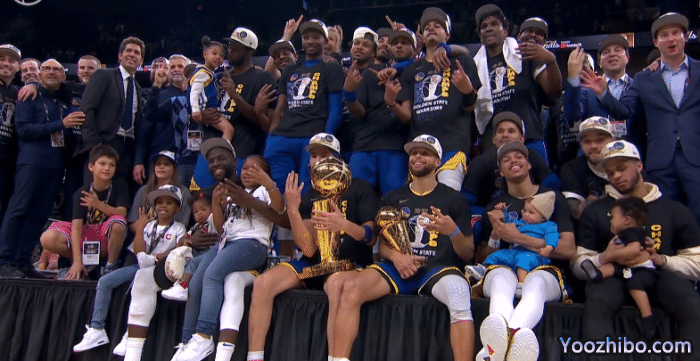 勇士这一张全家福很特别,很多球员都抱着自己的孩子,而一直单身的汤普森紧紧抱着奥布莱恩杯;全队合影期间,库里和汤普森闲聊,之后库汤追三巨头合影,这是他们最近8年拿到的第4个总冠军,然后伊戈达拉也坐过来与三巨头合影。