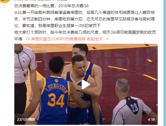由此带来的事情就在G6开始前,已经有勇士的球迷担心会在G6的北岸花园球馆遭遇到争议的判罚,甚至还有体育博主谈到了6年前的NBA总决赛G6,当时也是手误赛点的勇士,客场不敌骑士,当时裁判就引发了巨大的争议,后期才有了勇士输掉G6后与骑士鏖战抢七大战,遗憾被对手4-3翻盘的经历。