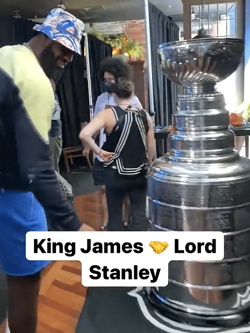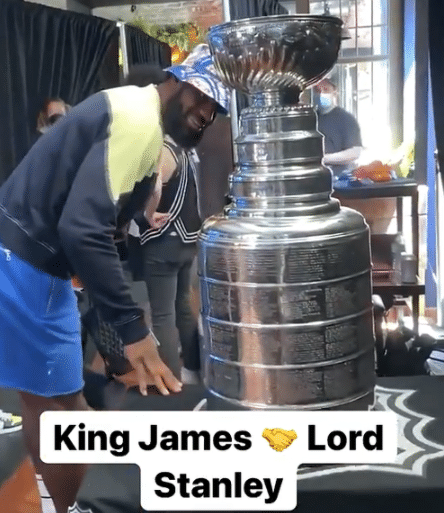 詹姆斯对外给自己的称呼就是国王,这次在入场期间詹姆斯见到了NHL的冠军奖杯斯坦利杯,他从一看到奖杯,目光就一直锁定,仔细端详了一番并发出了惊叹,最后还碰了碰斯坦利杯。詹姆斯也在个人社媒转发了这则视频并配文写到:“太美啦!!!”
