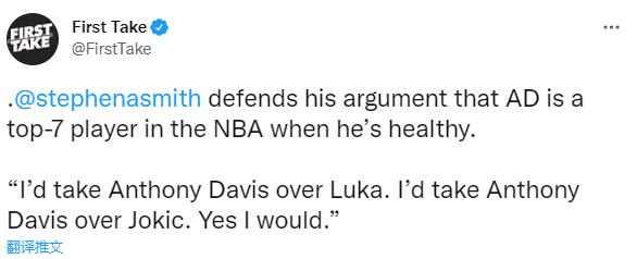 A-史密斯在节目中表示:在我看来,健康的戴维斯就是现役前七的球员,他比约基奇更好。不用提醒我约基奇有多强,他是MVP,有不可思议的手感和传球技巧,但戴维斯就是比他更好,健康的AD也比东契奇更好。