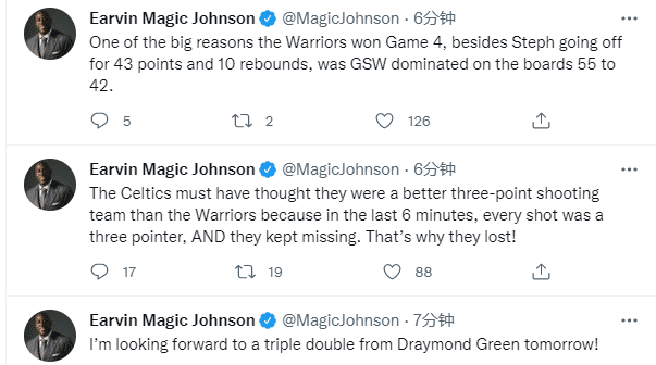 对于凯尔特人总决赛第四场被逆转输球,魔术师分析绿军输球原因,发推写道:凯尔特人队一定认为他们是一支比勇士拥有更好三分的球队,因为在G4最后6分钟,他们每一次投篮都是三分球,而且他们一直没有命中;这就是他们输的原因!