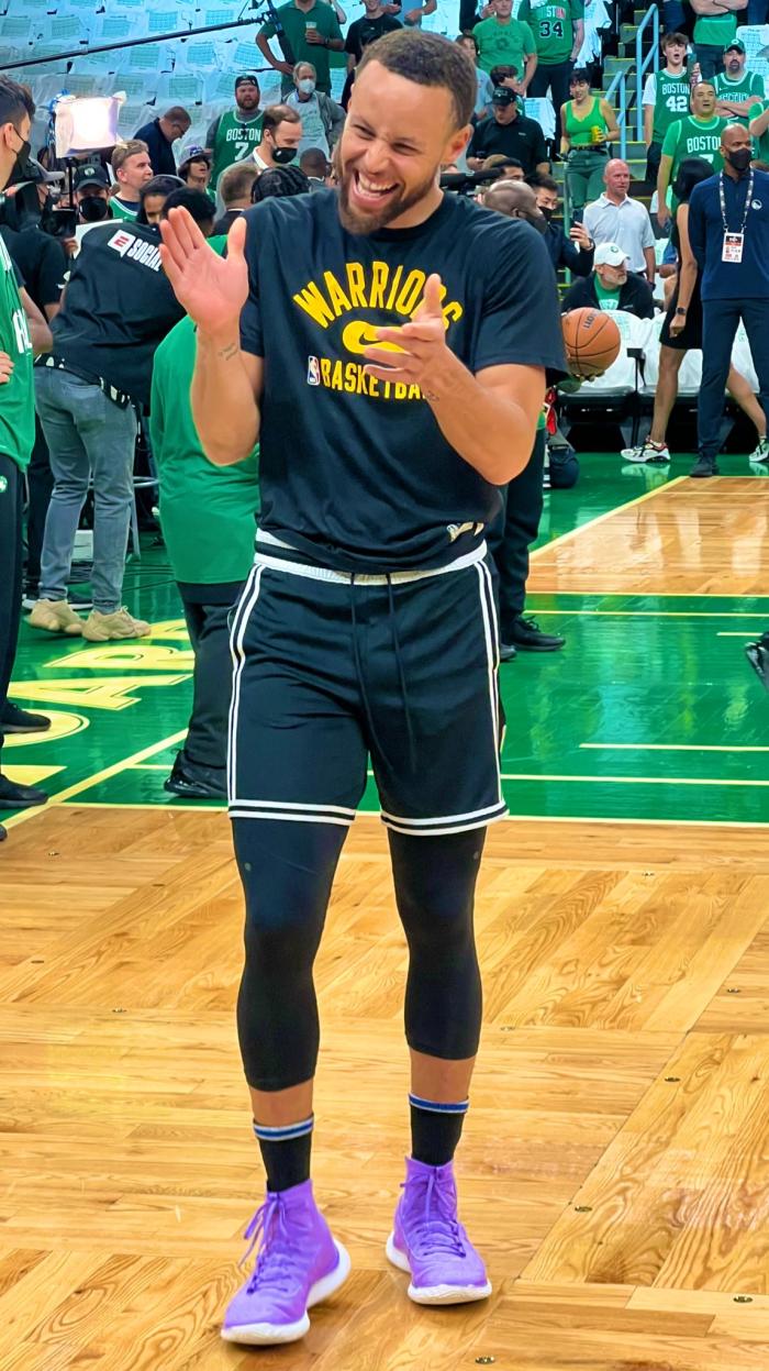 在G3末节的一次地板球争夺中,库里的脚被霍福德压伤,所幸免遭严重伤病;G4赛前热身时,库里几乎不受脚伤的困扰;库里从球员通道跑进球场,场边的勇士球迷为他欢呼,库里进行对抗训练、强硬突破上篮;定点跳投以及持球后撤步投篮和轰进logo超远三分。