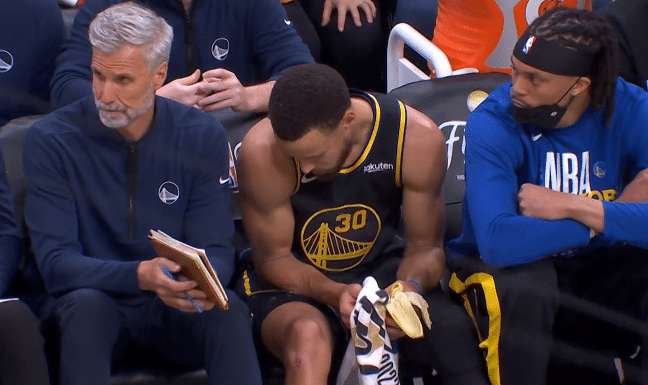 勇士首节27-28落后1分,库里打满12分钟拿到12分3篮板2助攻,反击上篮、连中两记三分以及迎着罗威高难度得分,攻防两端都被凯尔特人消耗,惨遭罗威大帽;很明显,库里打得很累,第二节坐在替补席休息时,他赶紧吃香蕉补充体力。