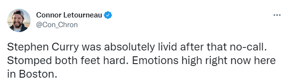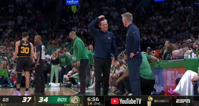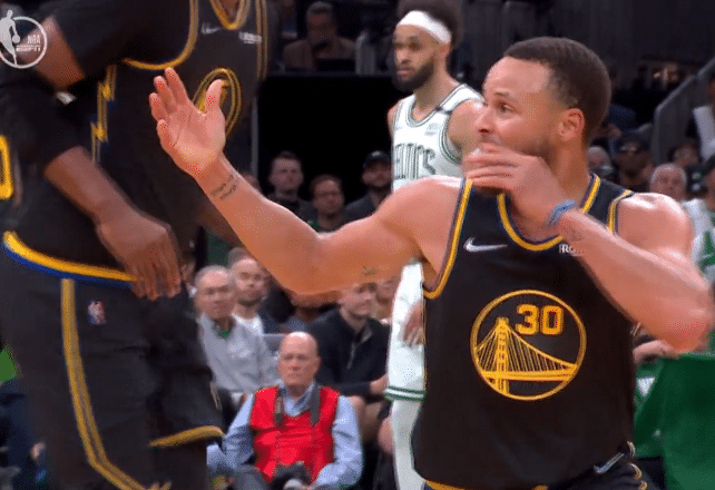第二节,库里上场后强硬突破,挤开霍福德上篮得分,之后外线频频打铁,期间科尔不满普理查德走步违例,怒吼抱怨吃到技术犯规,库里为科尔找主帅理论;勇士在第二节突然断电,被凯尔特人打出10-0攻势,库里强突2+1止血,不过半场打完,勇士49-54落后5分。