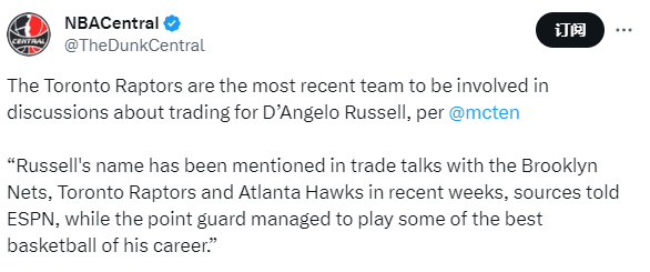 据名记Dave McMenamin报道,最近几周,拉塞尔的名字出现在与篮网、猛龙和老鹰的交易谈判中,目前他正打出职业生涯不错的表现。