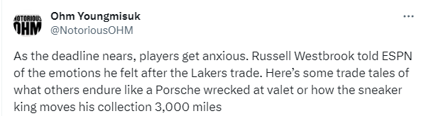Ohm Youngmisuk透露,那段日子,威少起初与孩子们长时间待在一起,每天送他们去学校。但随着下家短期内无法确定,威少开始有些焦躁,随后他前往了拉斯维加斯,在四天的训练营中一天至少训练三次。