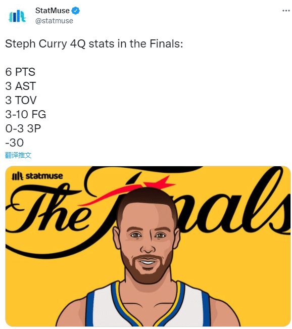 不过总决赛前三战,库里在末节的表现很糟糕,美媒StatMuse晒出一组库里在总决赛末节的数据,两场比赛(G2没打末节)合计得到6分2篮板3助攻1抢断3失误,10投3中(三分球3中0),正负值为-30!