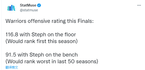 对于勇士来说,库里对球队的影响非常大,据美媒StatMuse统计,在本次总决赛中,当库里在场时,勇士的进攻效率为116.8,该数据能排名本赛季的榜首位置;当库里不在场时,勇士进攻效率为91.5,是近50年来总决赛的最低值。