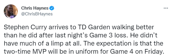 此前名记Shams报道,乐观预计库里会出战总决赛G4,库里不需要接受核磁共振检查(MRI),他的左脚也避免了严重的问题。