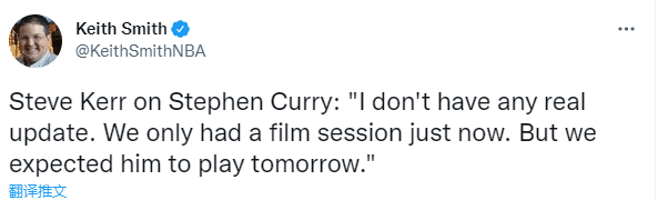 对于库里的伤情,科尔表示:对于库里的伤势,我没有其它的更新,我们今天只是看了录像。但我预计库里会出战下一场比赛。今天球队没有训练,我们把今天当作是一个康复日。