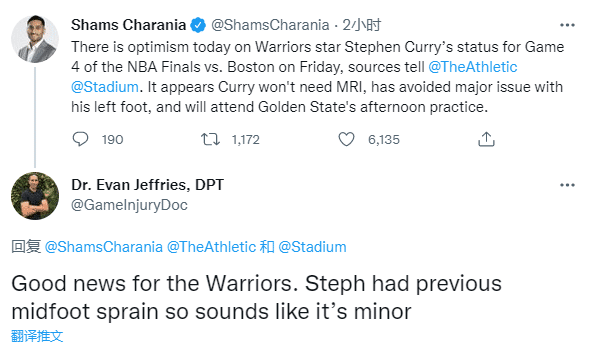 医学专家Evan Jeffries表示,勇士好消息,库里曾遭遇中足扭伤,这次他的伤势很轻微。