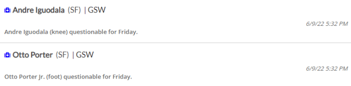 来源:JRS直播网06-10 11:26JRS直播网06月10日讯 ,勇士和凯尔特人总决赛G4伤情出炉,绿军全队仅罗威(左膝酸痛)一人被列为出战成疑,勇士队则是伊戈达拉(膝盖伤势)、小奥托-波特(脚部伤势)出战成疑,50%可能性出战;库里(左脚酸痛)大概率出战,此前库里表态他将带伤出战G4,小佩顿已经不在伤病名单上。