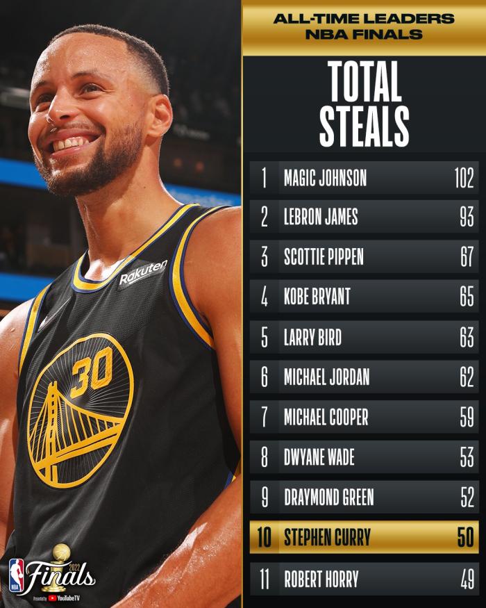 1、库里总决赛抢断数超越罗伯特-霍里升到历史第10位
