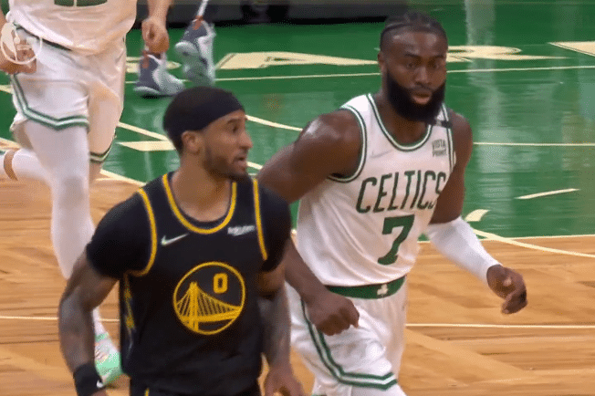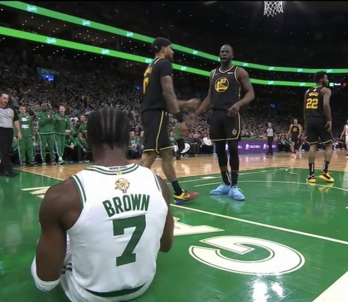 来源:JRS直播网06-09 10:49JRS直播网06月09日讯 ,勇士和凯尔特人总决赛G3正式开打,杰伦-布朗第一节再次大爆发,单节9投6中、三分4中3轰下17分5篮板3助攻,晃倒小佩顿太狠,惨遭格林大帽后被喷垃圾话挑衅,绿军球迷为布朗抱不平,全场怒喷格林垃圾。