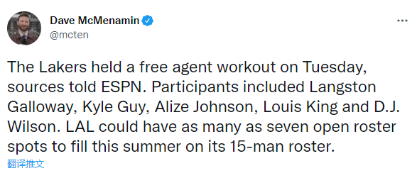 今天湖人试训的自由球员分别是兰斯顿-加洛韦、凯尔-盖伊、阿利兹-约翰逊、路易斯-金、DJ-威尔森,其中加洛斯和约翰逊都曾为篮网效力过。