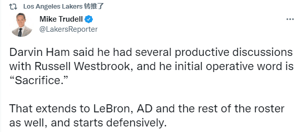 哈姆透露他们之间已经有过几次一对一的交谈,并且他们之间经常说到的一个词是“牺牲”。哈姆希望威少能够坚韧不拔,在无球以及防守端都应该能做到这样。