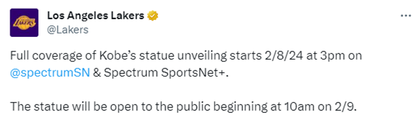湖人官方宣布,球队名宿科比的雕像将于北京时间2月9日揭幕,2月10日上午向公众开放;据悉,所有参加科比雕像揭幕仪式的嘉宾和球迷都必须持有特定的仪式门票才能进入现场, 比赛门票不被允许参加这一仪式。
