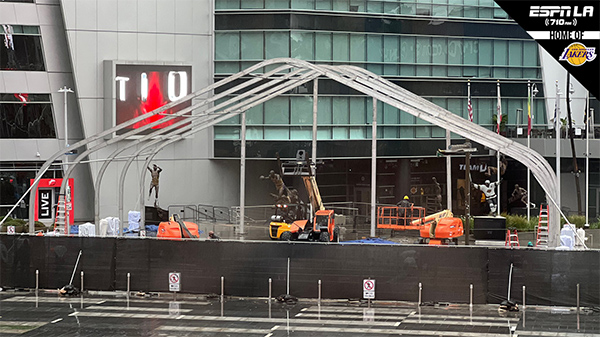 目前湖人球馆大门前正在施工,这是为几天后的科比雕像揭幕仪式做准备,科比雕像即将揭幕,不过目前还不知道科比雕像的具体造型。