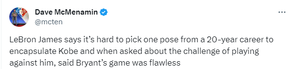 早些时候谈到科比雕像,詹姆斯表示:很难选择某一个画面来为他树立雕像,因为有太多充满回忆的时刻,他在这支球队效力了20年,赢下了多个总冠军,他有一段时间是我们所有人崇拜的对象,他在场上也同样激励着我。