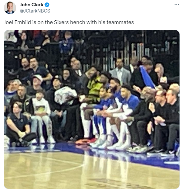 恩比德的左膝半月板受伤后首次公开亮相,今日恩比德身穿鲜艳外套,坐在76人替补席观看比赛;据报道,恩比德将在本周接受半月板修复手术,暂不确定具体休战时间,名记shams表示最乐观估计,恩比德要休战1-2个月,若接受完全修复手术,他将缺席更久。