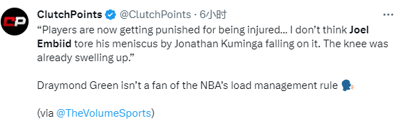 对于恩比德的半月板受伤,追梦表示:我不是医生,但我认为不是库明加那一摔导致恩比德撕裂了半月板,他的膝盖之前就肿着了。恩比德是被联盟的那些规则搞伤的,我承认,之前是有球员在轮休,但NBA完全可以去调查那些缺席的球员,看看他们到底是什么情况。MVP是很难得到的,而恩比德本有机会蝉联。但现在他有可能会缺席很长时间,原因只是联盟制定规则不让球员轮休。