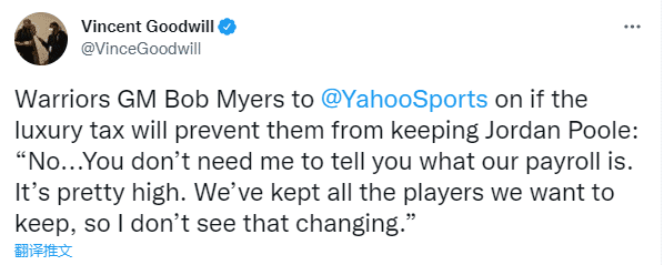 勇士总经理鲍勃-迈尔斯表示:不会,我的意思是,谢天谢地我是在为乔-拉科布工作,他致力于用各种资源取胜,我知道这一点,因为我每次问他阵容和策略问题时,他总是表示我们的重点是赢球。