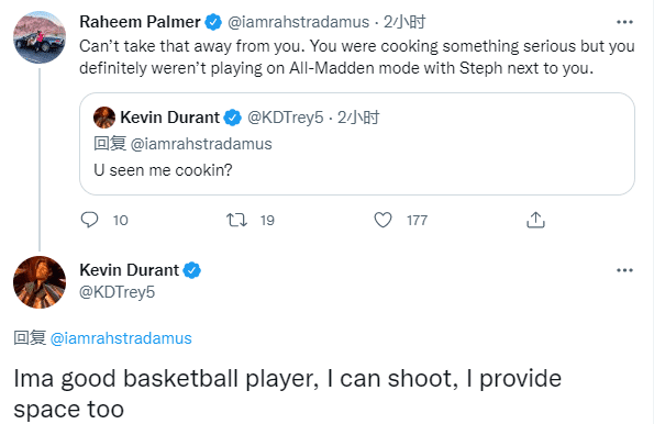 有球迷在评论区回复杜兰特:这和比赛风格不同有关,杜兰特持球进攻,没给对手包夹的时间,而库里运球刚过半场就被包夹了;杜兰特回应:当我在场上时,库里从未被包夹过,明目张胆的谎言。