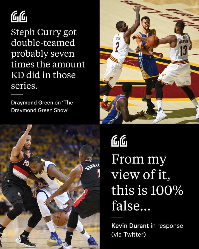 杜兰特又回应:哦,我看到了,我的兄弟,我很欣赏你的赞美,但我不同意你所说的双人包夹,仅此而已。我喜欢这个节目。