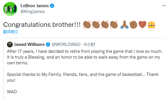来源:JRS直播网06-01 10:46JRS直播网06月01日讯 ,勒布朗-詹姆斯前队友贾瓦德-威廉姆斯在社交媒体上宣布正式退役,老詹本人发推祝贺:恭喜我的兄弟(4个鼓掌+拳头+爱心+王冠表情)。