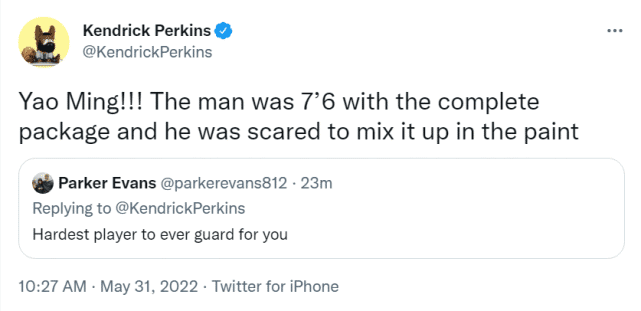 来源:JRS直播网05-31 16:54JRS直播网05月31日讯 ,名嘴肯德里克-帕金斯在社媒上与球迷们互动。一位球迷问他,谁是你防过最难防的球员,帕金斯的答案是姚明。“姚明!!!他身高7尺6,还带有全面的技能包,他在内线结合这些东西就太可怕了。”