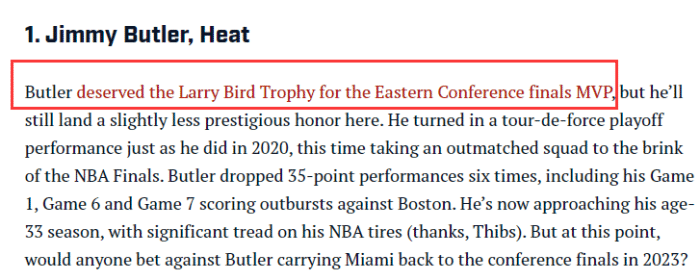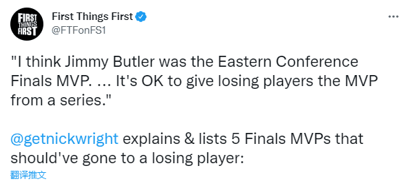 名嘴Nick Wright在节目中表示:我认为巴特勒应该获得东决MVP,把这个MVP给输掉系列赛的球员也是没问题的。