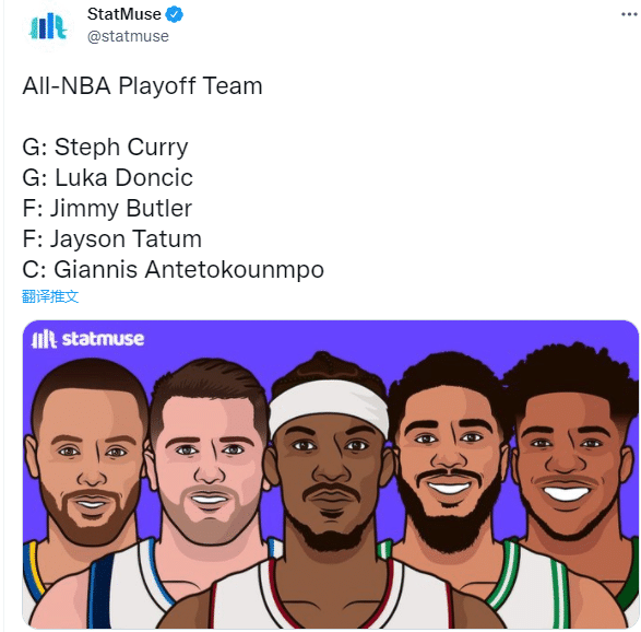 美媒StatMuse评选今年季后赛最佳阵容:后卫线库里和东契奇,前锋分别是巴特勒和塔图姆,内线是字母哥;巴特勒携手四大球星上榜,这也是对巴特勒的一种认可。