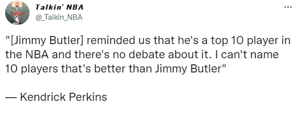 巴特勒出局后,帕金斯不仅表示巴特勒的三分出手没问题,而且盛赞巴特勒是联盟前十级别的球星,毫无争议,我无法说出比巴特勒更好的10名球员。