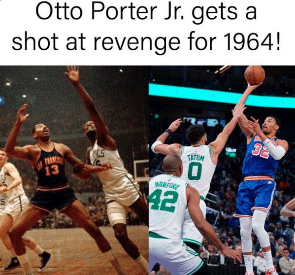 大家关心波特的伤情,还有一点,就是希望他可以在“58年后复仇”。社交媒体上一张照片火了,这是1964年NBA总决赛,旧金山勇士以1-4不敌凯尔特人丢掉冠军,而当时在勇士效力的张伯伦被对手冲垮,虽然张伯伦在1964年总决赛中场均砍下了29. 2分外加27. 6个篮板的数据,但面对巅峰凯尔特人,张伯伦还是无缘冠军。因为波特和张伯伦的模样非常像,所以有美媒表示:复仇机会来啦。