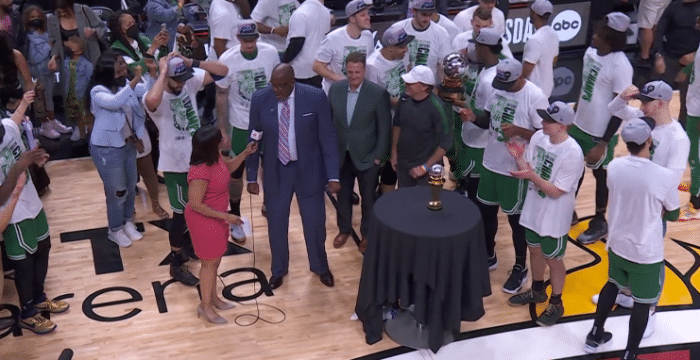 赛后凯尔特人众将捧起东部冠军奖杯,霍福德第一个接过东部冠军奖杯;塔图姆夺得东决MVP,全队为他欢呼庆祝。